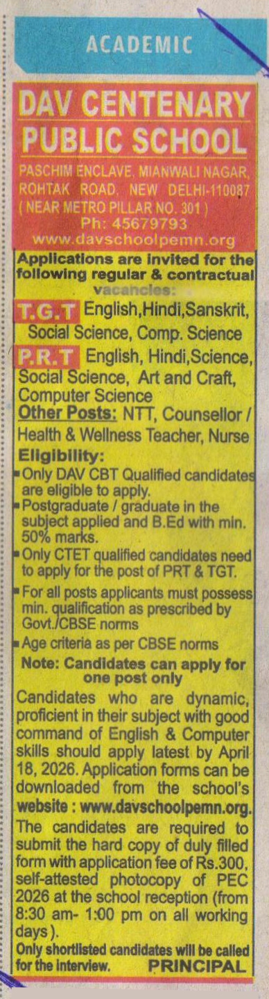 DAV Centenary Public School Paschim Enclave, Mianwali Nagar, New Delhi - 110 087 CBSE Affiliation No. : 2730289, School Code : 85343 DoE Reg. Id. : 1617177 Tel.No. : 011-45679793 (Senior School), 011-40396196(Junior School)