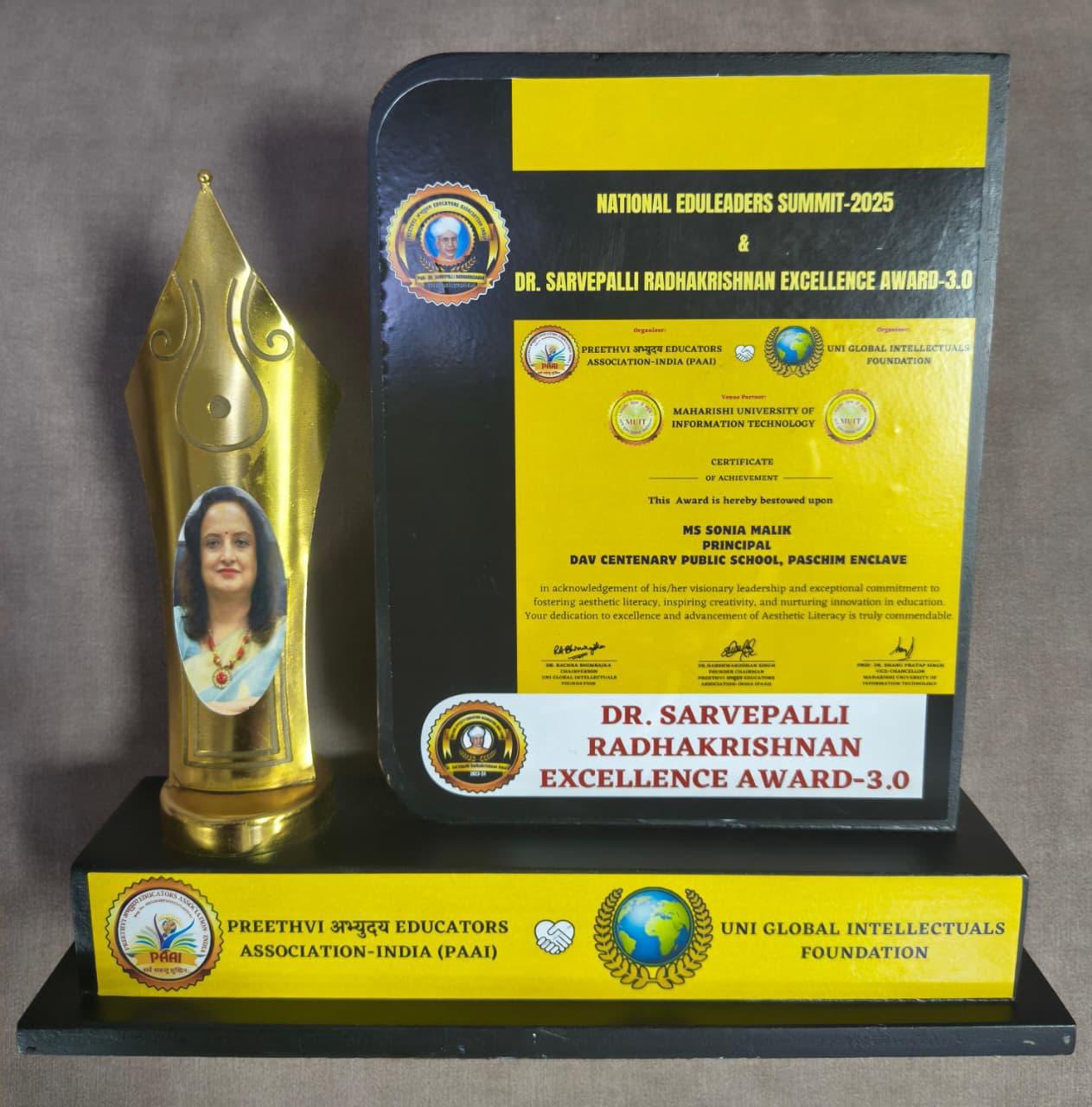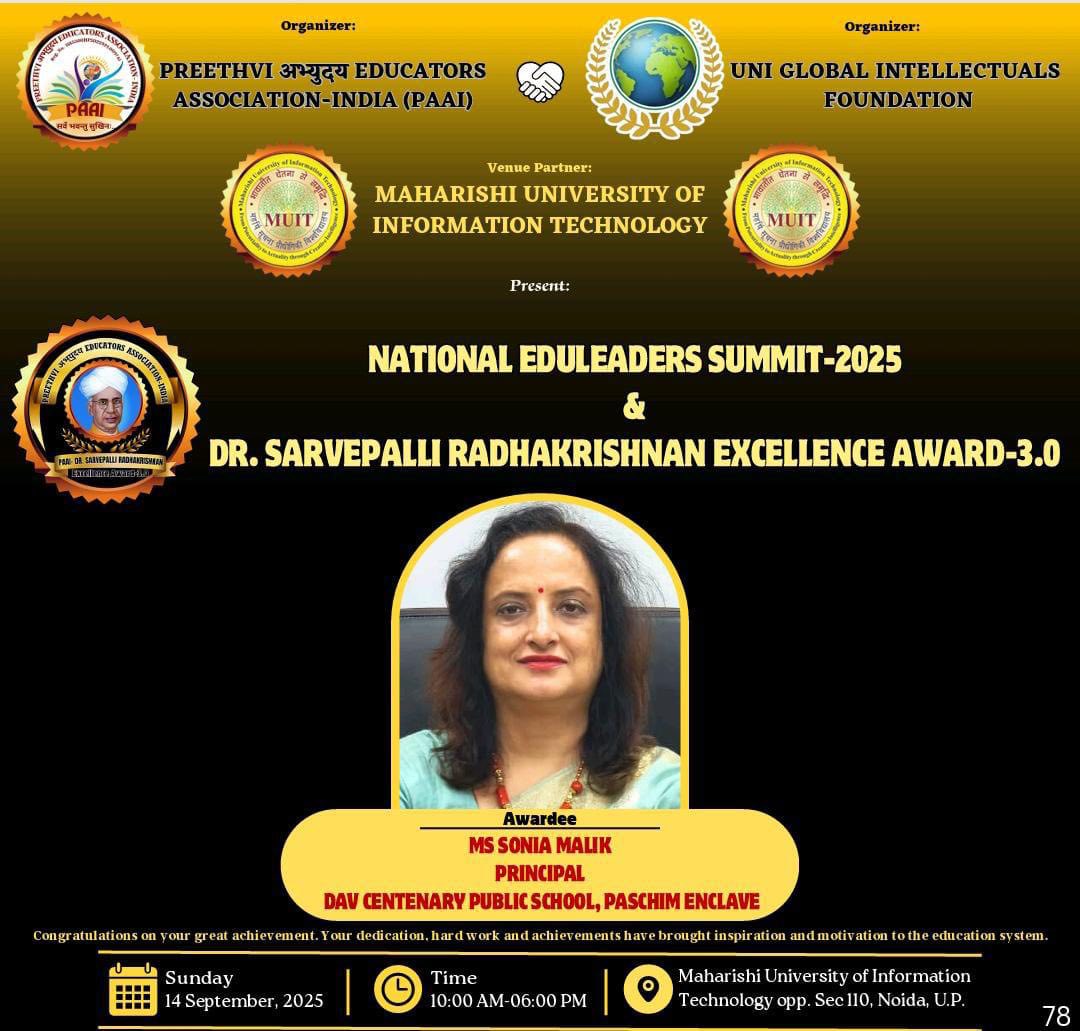 We are glad to share that our Principal, Ms. Sonia Malik, has been honoured with the prestigious Dr. Sarvepalli Radhakrishnan Excellence Award 3.0 at the National Eduleaders Summit organized by the Preethvi Abhyuday Educators Association India and Uni Global Intellectuals Foundation on September 14, 2025.